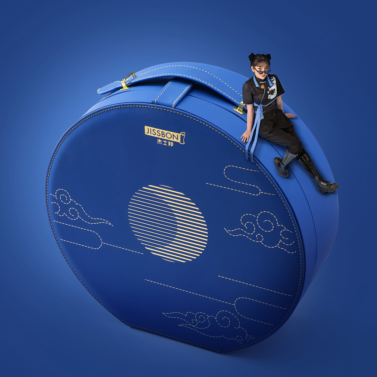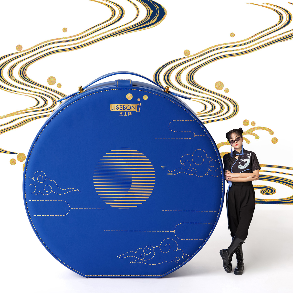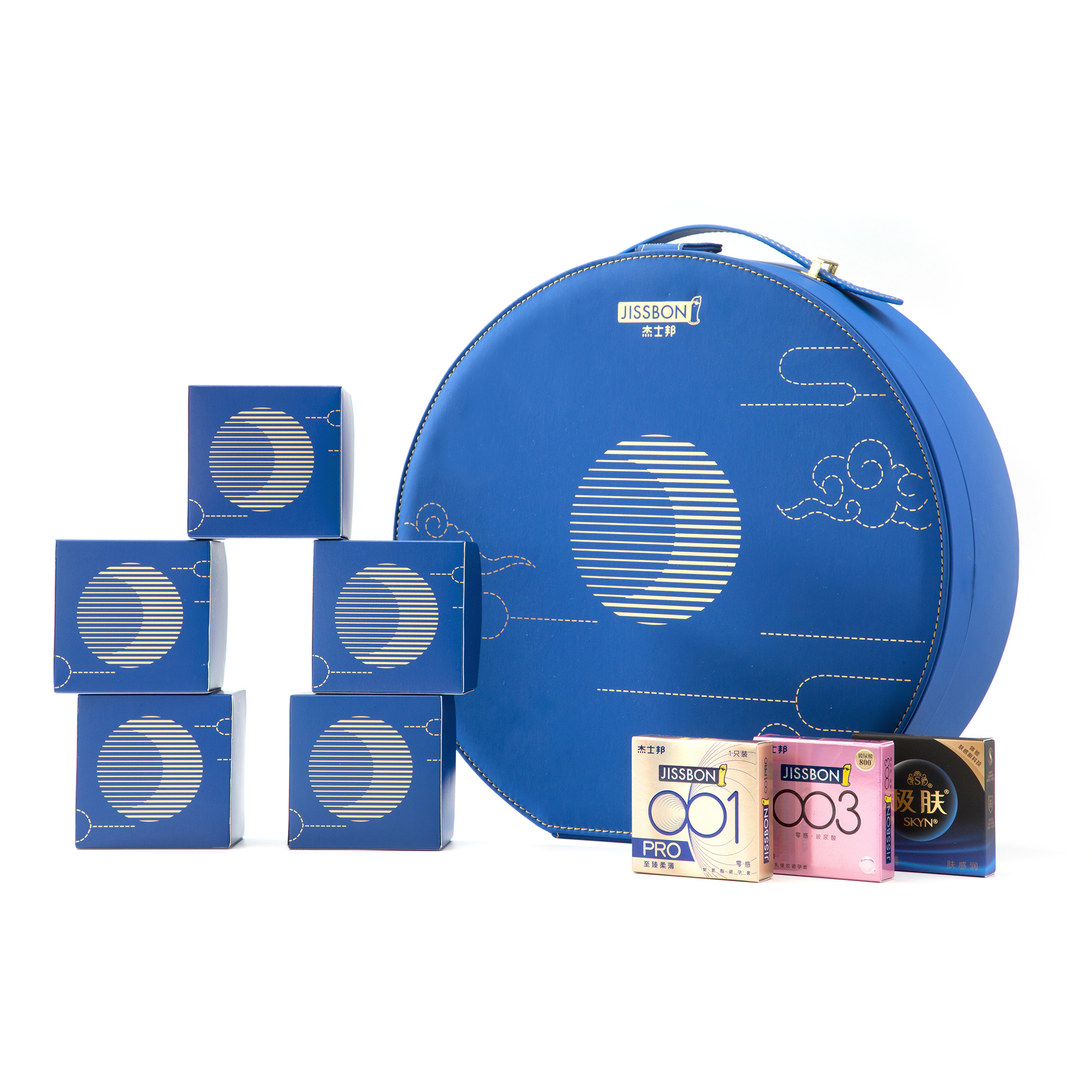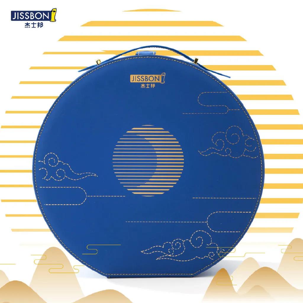 整个包装外盒呈圆形,藏蓝色仿革皮质凸显高端感